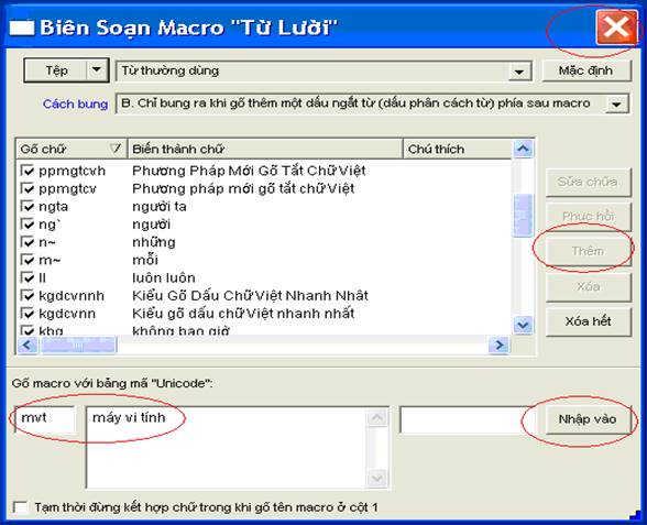 Lười” cho tệp gõ tắt “Từ thường dùng”. Ví dụ, muốn thêm macro |mvt = máy vi tính| vào tệp “Từ thường
